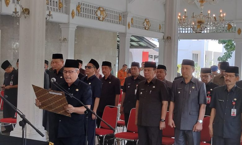 KUNINGAN–Sebanyak 21 kepala dinas dan badan di lingkungan Pemerintah Kabupaten (Pemkab)_ Kuningan menjalani proses mutasi dan rotasi pejabat eselon II di Pendopo Setda Kuningan, Jumat (22/9/2023).