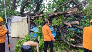 kacenews.id-CIREBON-Diduga akibat hujan deras disertai angin kencang, cabang pohon Angsana dengan diameter kurang lebih 20 cm dengan tinggi kurang lebih 6 meter tumbang menimpa kabel listrik dan satu warung pada Sabtu, 2 Maret 2024.