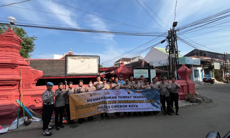Peringati HUT Bhayangkara Ke-78, Polres Cirebon Kota Bersih-bersih di Masjid Merah Panjunan