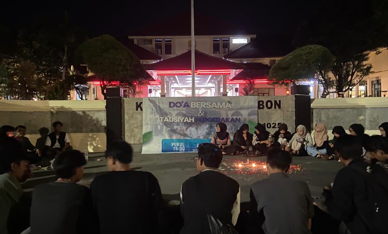 kacenews.id-CIREBON-Pengurus Cabang Pergerakan Mahasiswa Islam Indonesia (PC PMII) Cirebon bersama dengan Dewan Eksekutif Mahasiswa Perguruan Tinggi Keagamaan Islam Negeri (DEMA PTKIN) melaksanakan tausiyah pergerakan dan doa bersama depan Kantor Bupati Cirebon, Minggu (14/9/2025).