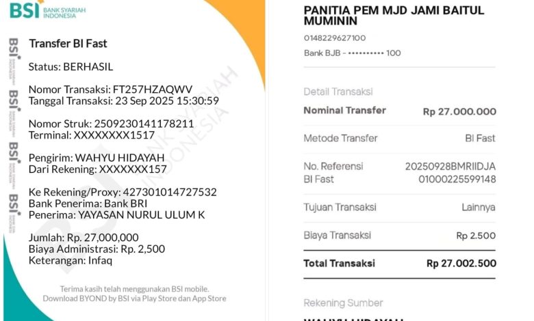 Di antaranya, bukti transfer atas nama Wahyu Hidayah dengan Nomor Transaksi: FT257HZAQWV tertanggal 23 September 2025 pukul 15:30:59 yang diduga menggunakan label Bank Syariah Indonesia (BSI). Tujuannya ke Nomor Rekening/Proxy: 427301014727532 ke penerima Nomor Rekening Bank Rakyat Indonesia (BRI) atas nama Yayasan Nurul Ulum K dengan keterangan, infaq.