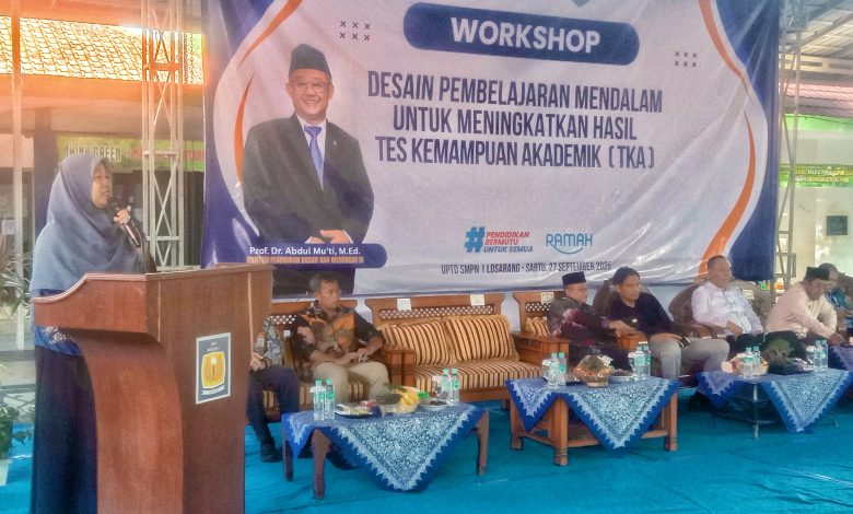 kacenews.id-INDRAMAYU-Menteri Pendidikan Dasar dan Menengah (Mendikdasmen), Abdul Mufti kunjungi Sekolah Menengah Pertama Negeri (SMPN) 1 Losarang, Kabupaten Indramayu untuk memberikan motivasi kepada peserta workshop selain meningkatkan Hasil Tes Kemampuan Akademik (TKA) yang diselenggarakan di aula pertemuan SMPN 1 Losarang, Sabtu (27/9/2025).