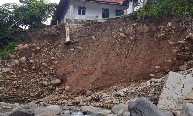 Dari luar, masjid tampak kokoh. Tapi bagian belakangnya kini menggantung di bibir jurang, setelah tanah pondasi ambles sejauh 12 meter dengan kerusakan memanjang hingga 40 meter. Setiap hari bangunan itu berjuang melawan waktu dan arus sungai yang semakin mendekat.