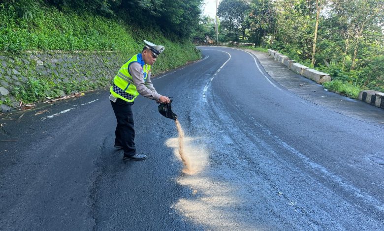 Mengantisipasi jatuhnya korban susulan, Ps. Panit Lantas Polsek Cikijing Aiptu Ade Deni berupaya menaburkan serbuk tertentu agar jalan yang terkena tumpahan oli tidak licin.