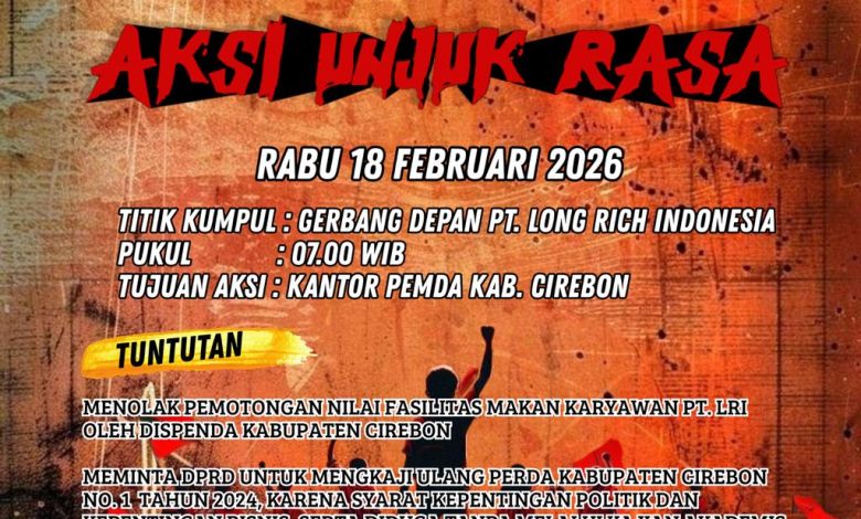 kecenews.id-CIREBON – Ribuan karyawan yang tergabung dalam Aliansi Serikat Pekerja/Butuh PT Long Rich direncanakan bakal demo ke Pemda Kabupaten Cirebon, Rabu (18/2/2026) mendatang. Sesuai surat pemberitahuan aksi yang beredar, Aliansi tersebut terdiri dari SP BISS, SPN, FSPMI, KASBI, GARTEKS, TSK SPSI akan melakukan longmarch dari Kantor PT Long Rich ke Kantor Pemkab Cirebon.