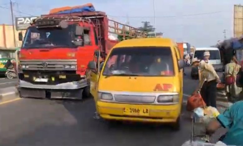 Sejumlah kendaraan milik pedagang maupun pembeli terlihat diparkir di bahu jalan. Kondisi itu membuat ruang lalu lintas menyempit dan menyebabkan antrean kendaraan cukup panjang di sekitar kawasan pasar.